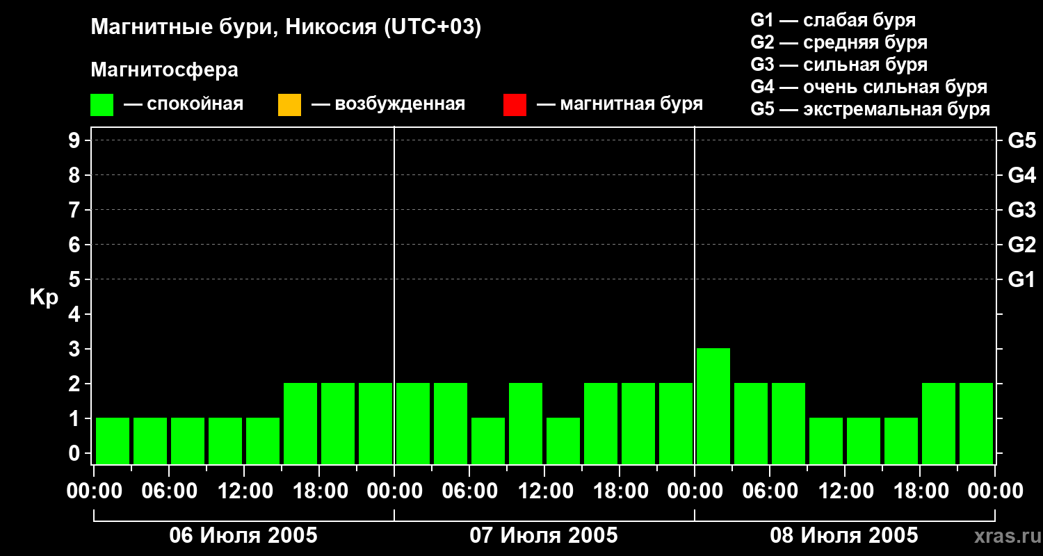 Изменения геомагнитного индекса Kp с 6 по 8 июля 2005 года для средних широт