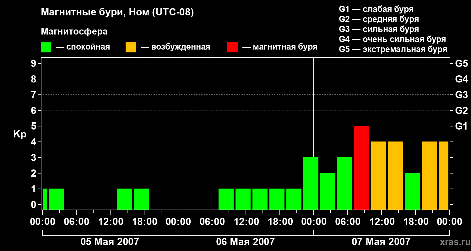 Изменения геомагнитного индекса Kp с 5 по 7 мая 2007 года для средних широт