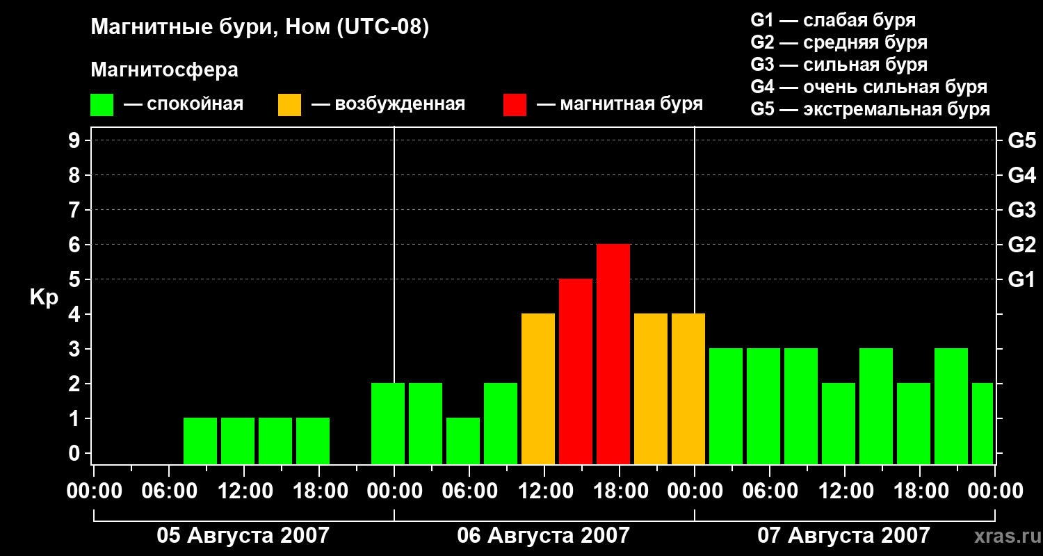 Изменения геомагнитного индекса Kp с 5 по 7 августа 2007 года для средних широт