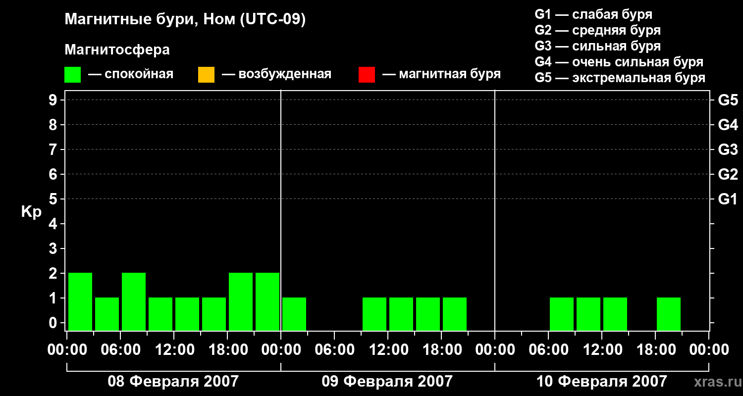 Изменения геомагнитного индекса Kp с 8 по 10 февраля 2007 года для средних широт