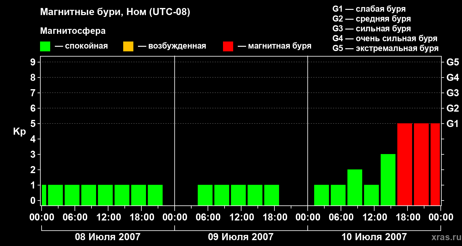 Изменения геомагнитного индекса Kp с 8 по 10 июля 2007 года для средних широт