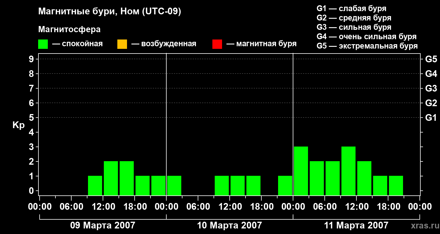 Изменения геомагнитного индекса Kp с 9 по 11 марта 2007 года для средних широт