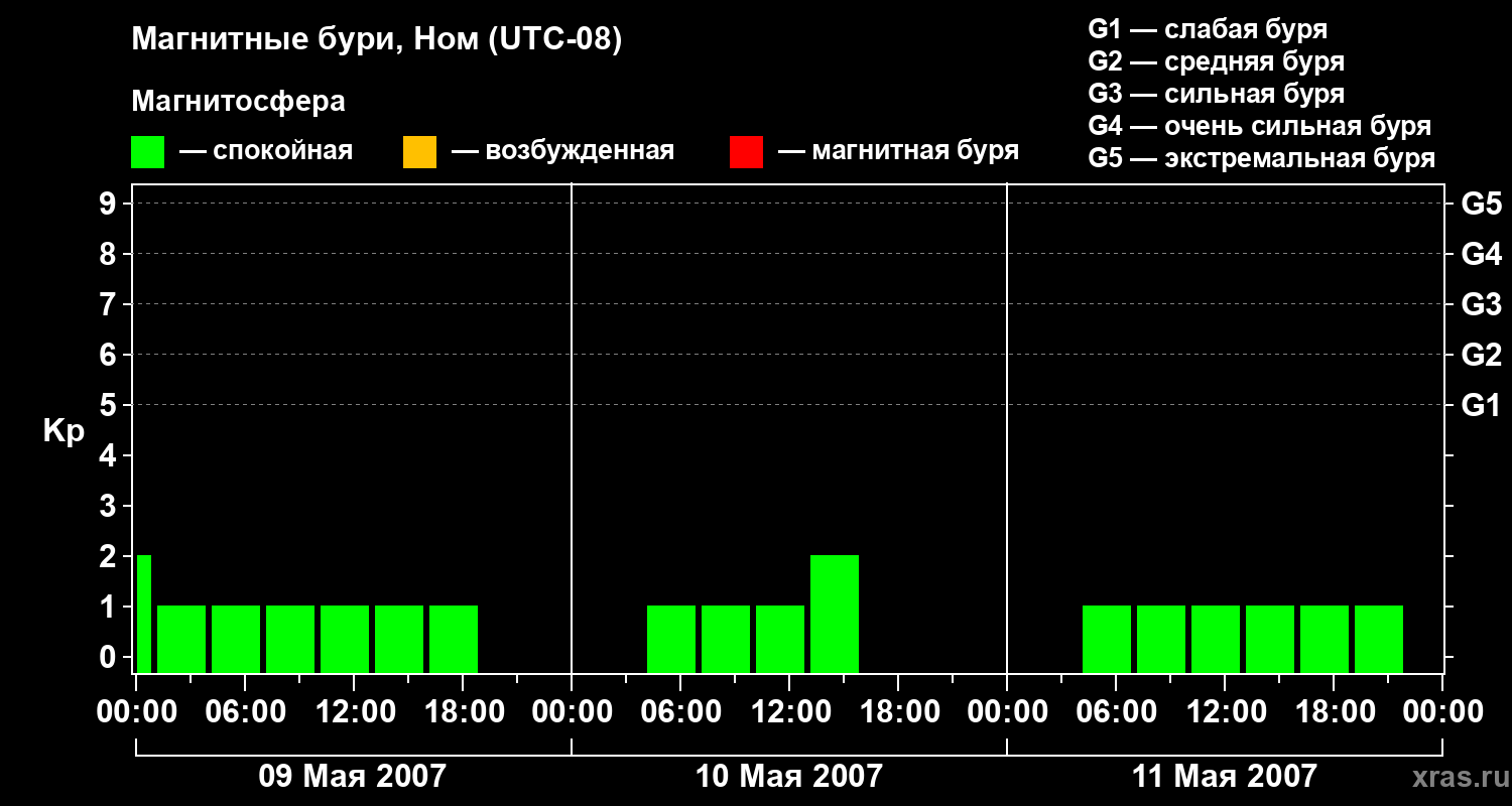 Изменения геомагнитного индекса Kp с 9 по 11 мая 2007 года для средних широт