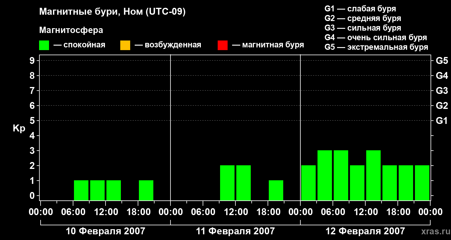 Изменения геомагнитного индекса Kp с 10 по 12 февраля 2007 года для средних широт