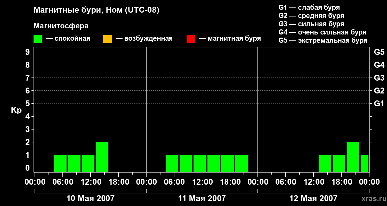 Изменения геомагнитного индекса Kp с 10 по 12 мая 2007 года для средних широт