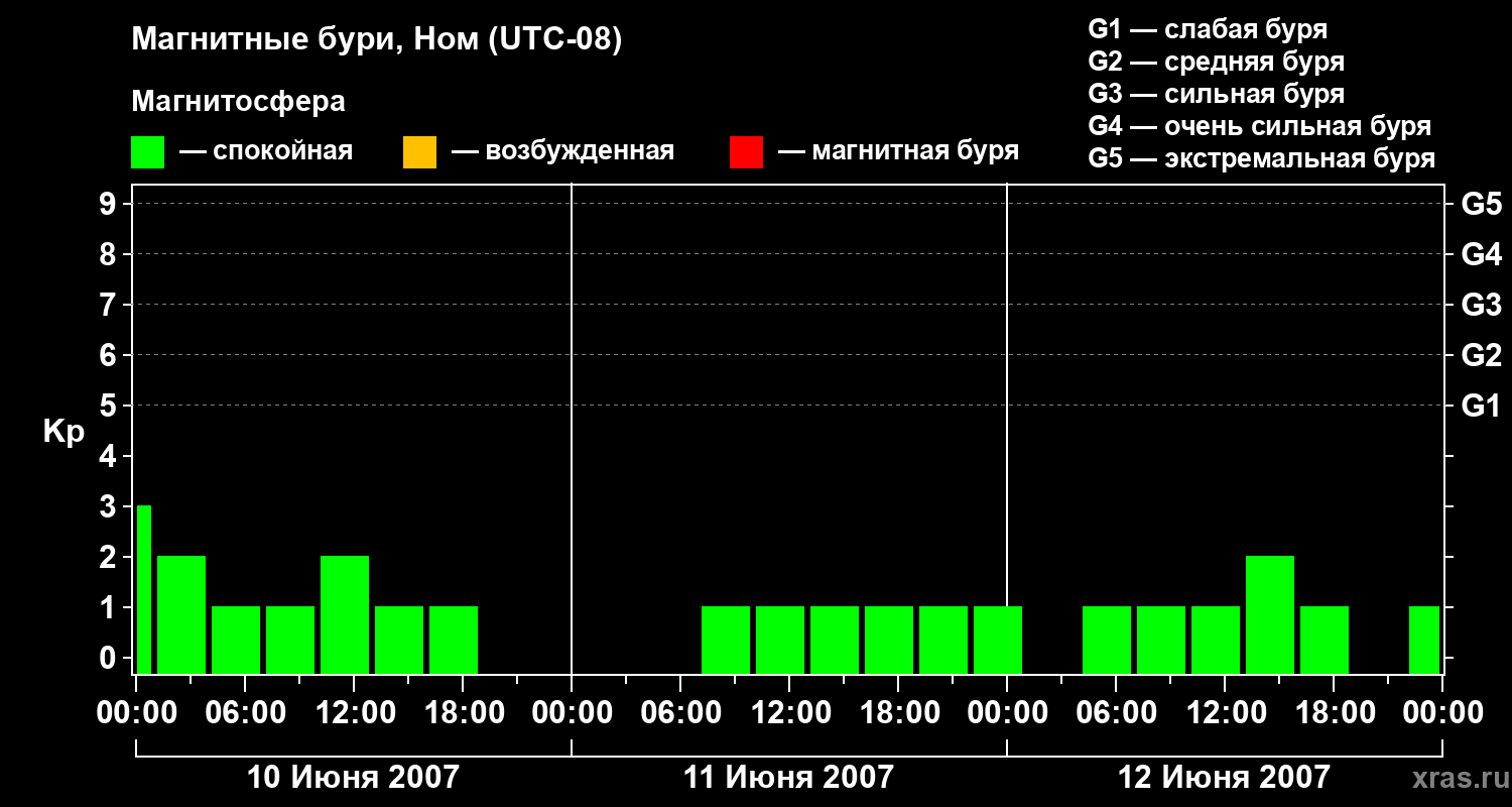 Изменения геомагнитного индекса Kp с 10 по 12 июня 2007 года для средних широт
