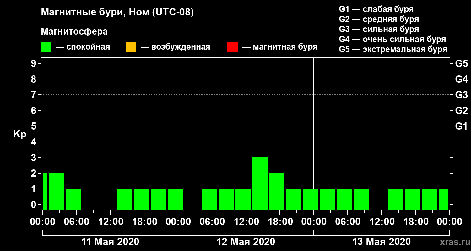 Изменения геомагнитного индекса Kp с 11 по 13 мая 2020 года для средних широт