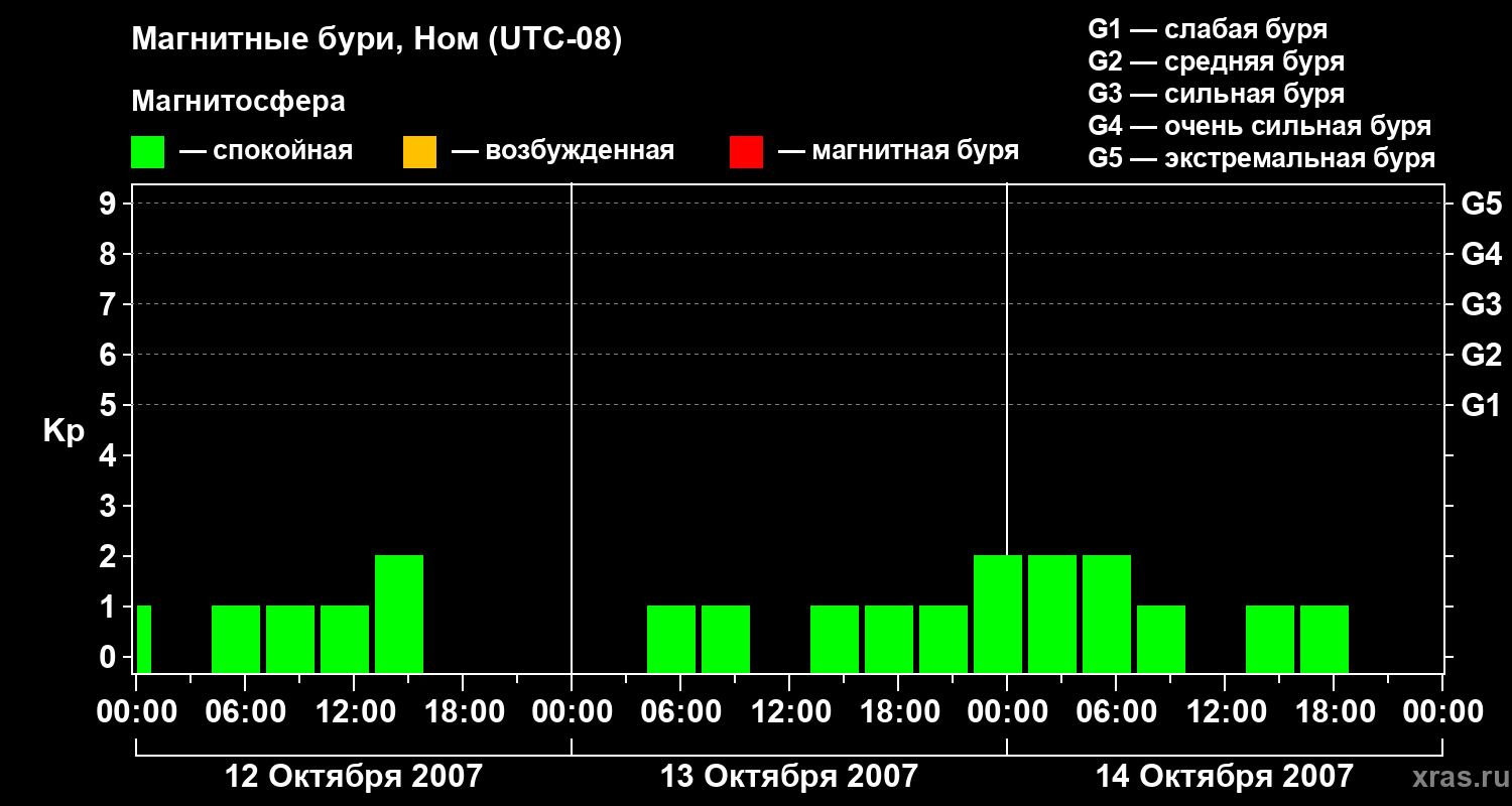 Изменения геомагнитного индекса Kp с 12 по 14 октября 2007 года для средних широт
