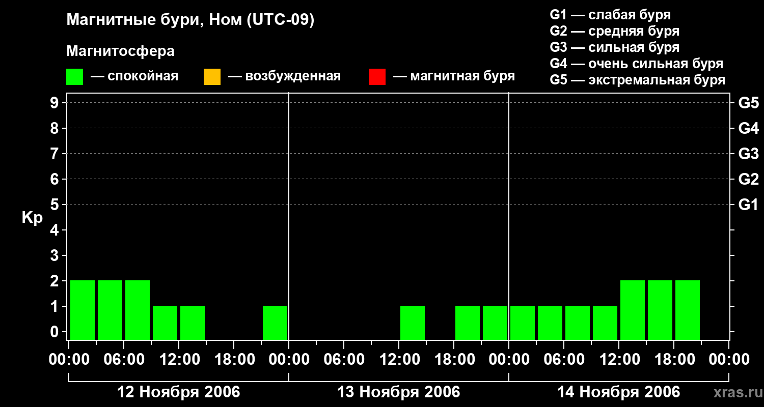 Изменения геомагнитного индекса Kp с 12 по 14 ноября 2006 года для средних широт