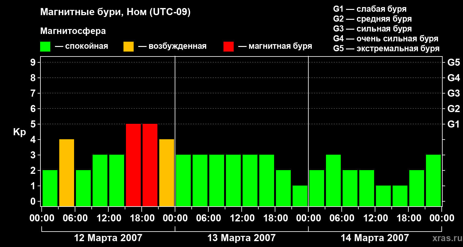 Изменения геомагнитного индекса Kp с 12 по 14 марта 2007 года для средних широт