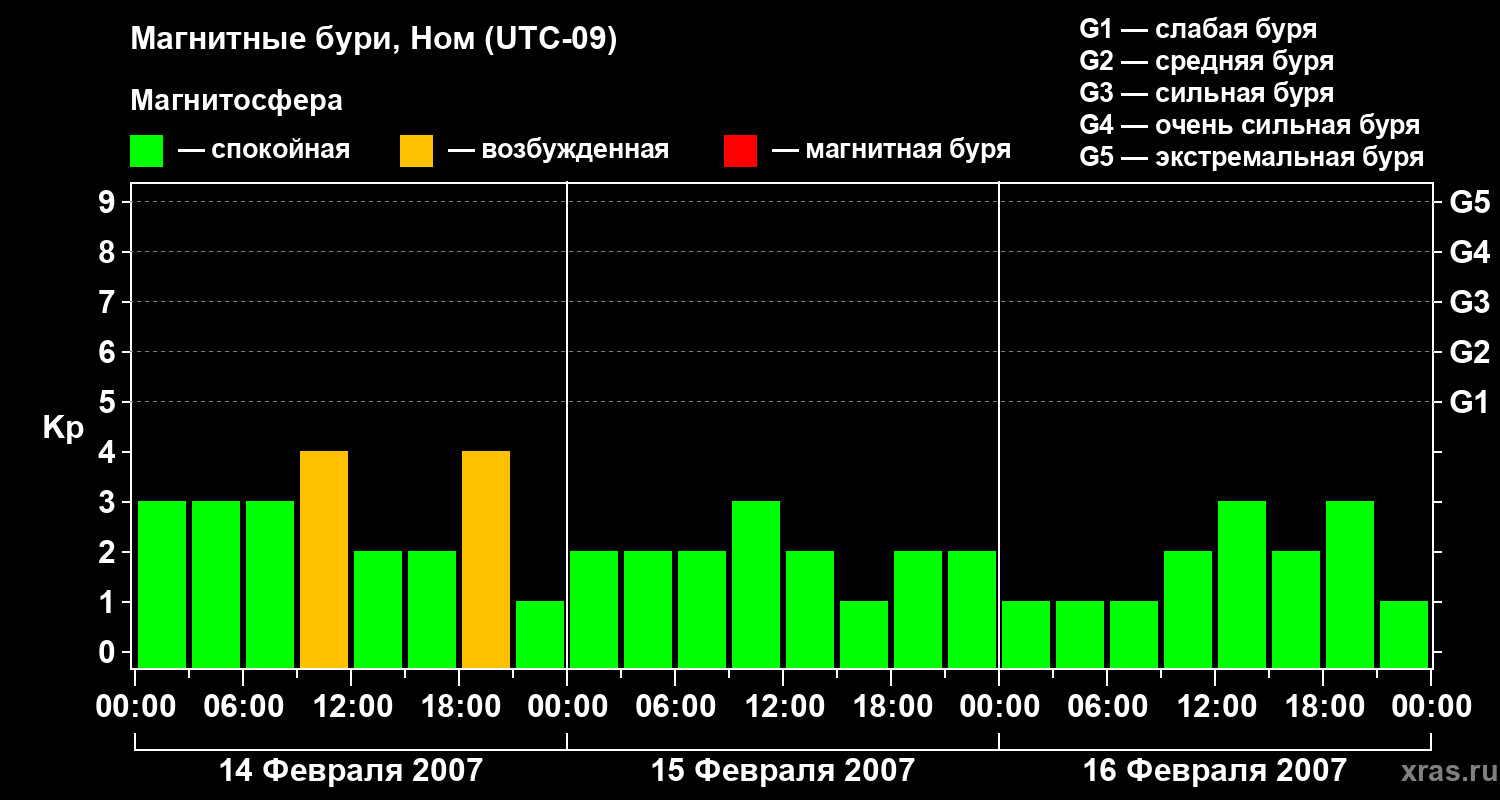 Изменения геомагнитного индекса Kp с 14 по 16 февраля 2007 года для средних широт