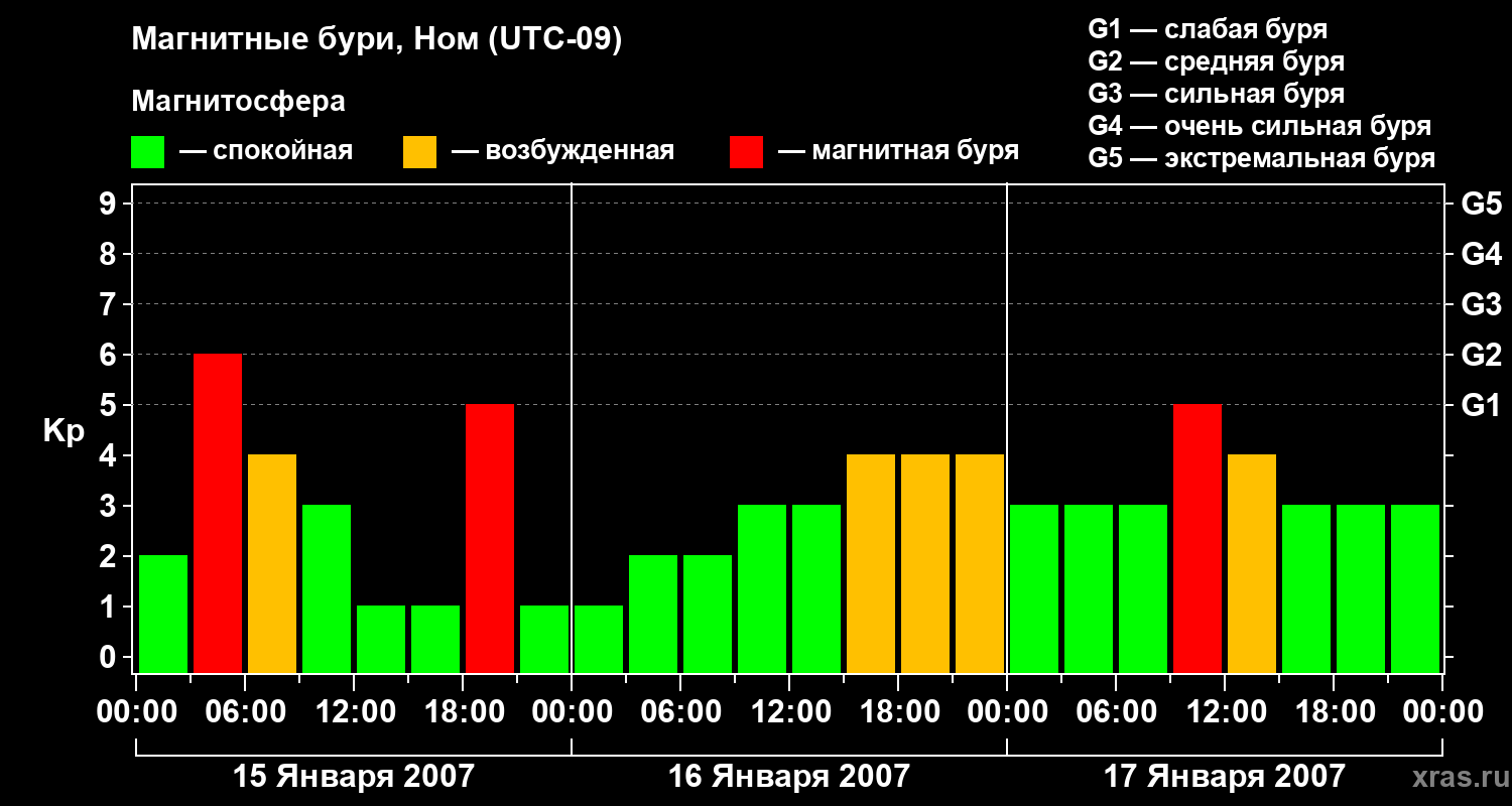 Изменения геомагнитного индекса Kp с 15 по 17 января 2007 года для средних широт