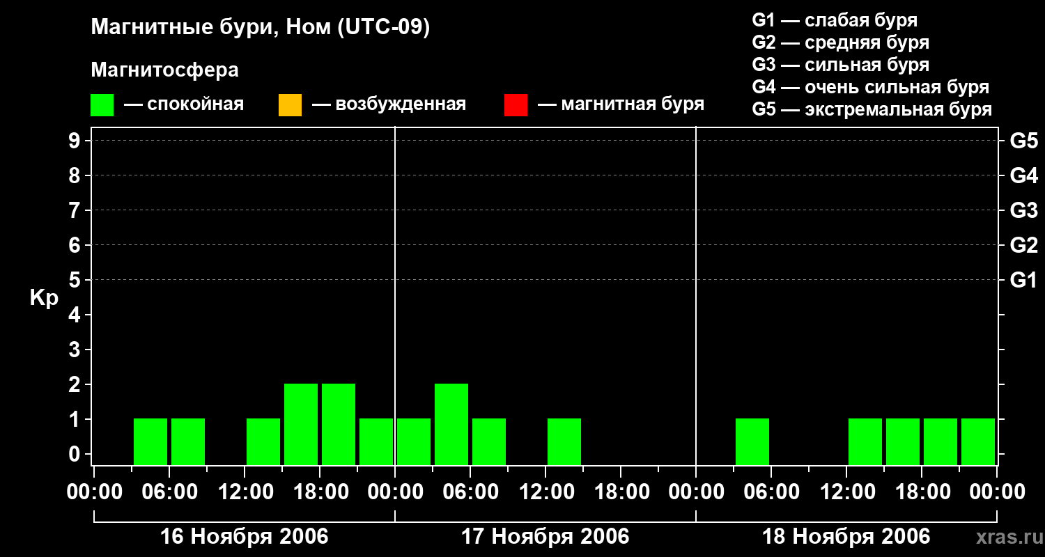 Изменения геомагнитного индекса Kp с 16 по 18 ноября 2006 года для средних широт