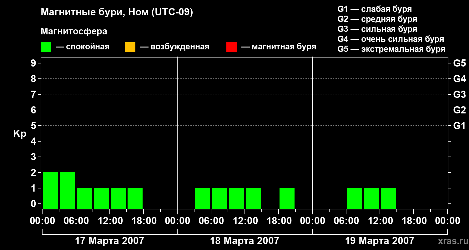 Изменения геомагнитного индекса Kp с 17 по 19 марта 2007 года для средних широт
