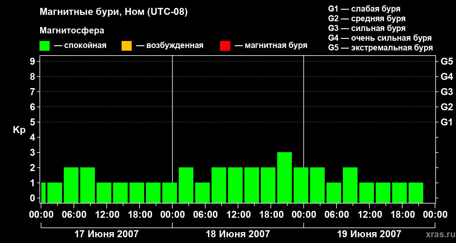 Изменения геомагнитного индекса Kp с 17 по 19 июня 2007 года для средних широт