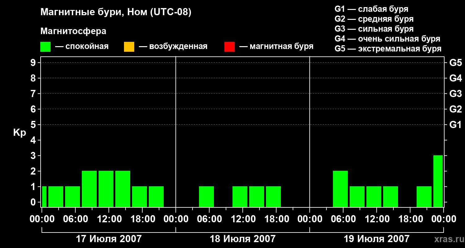 Изменения геомагнитного индекса Kp с 17 по 19 июля 2007 года для средних широт