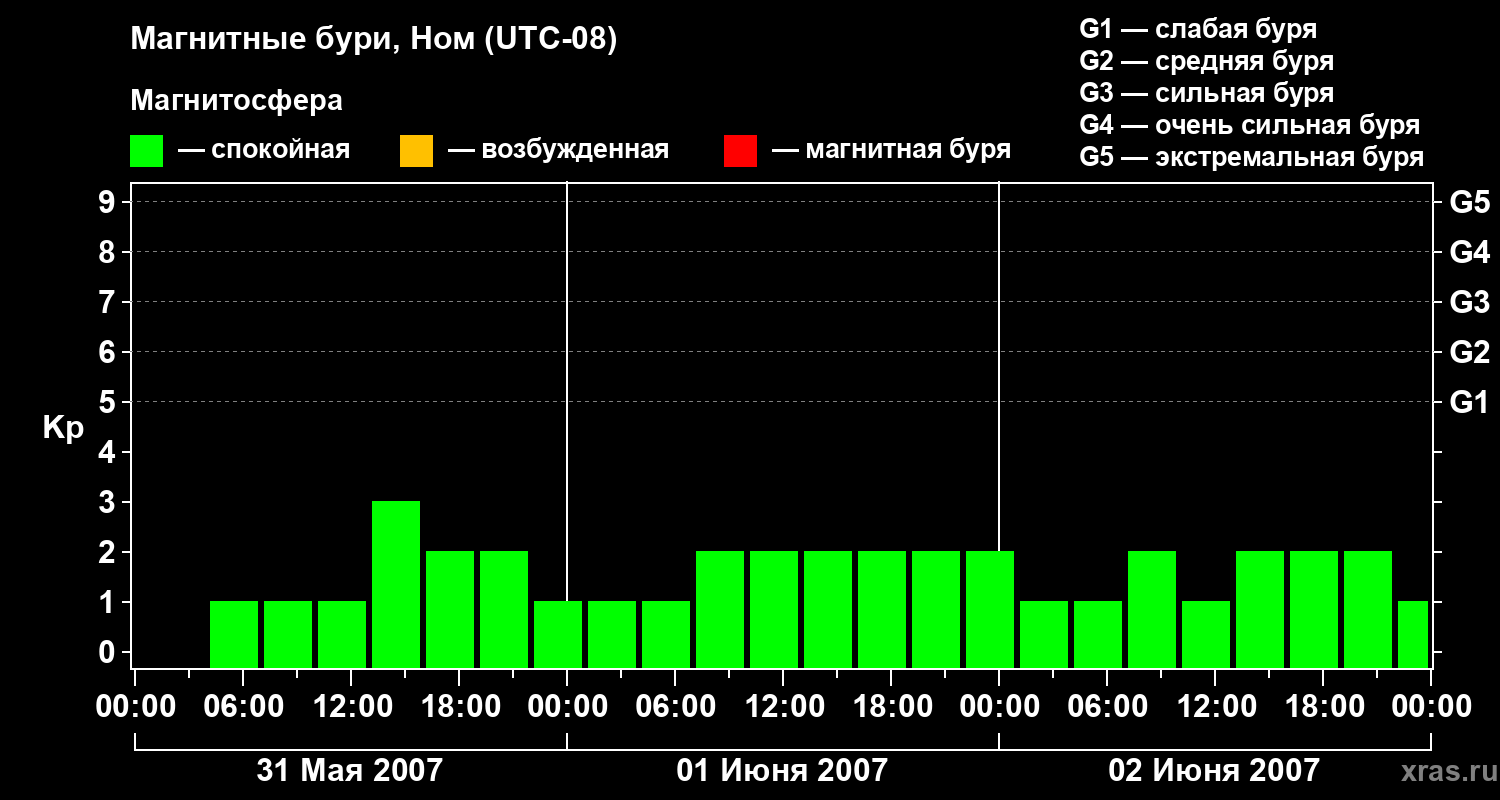 Изменения геомагнитного индекса Kp с 31 мая по 2 июня 2007 года для средних широт