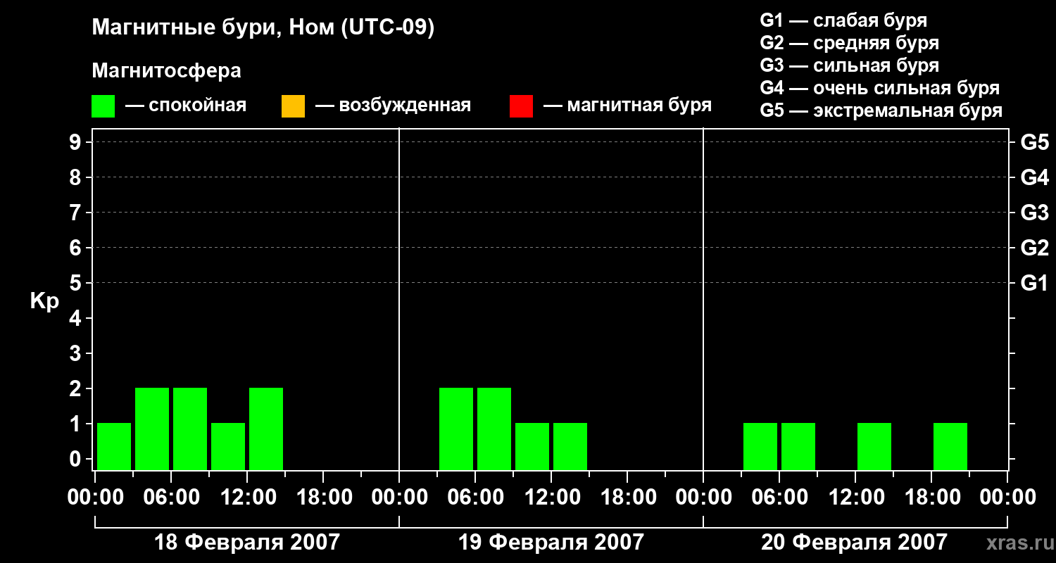 Изменения геомагнитного индекса Kp с 18 по 20 февраля 2007 года для средних широт