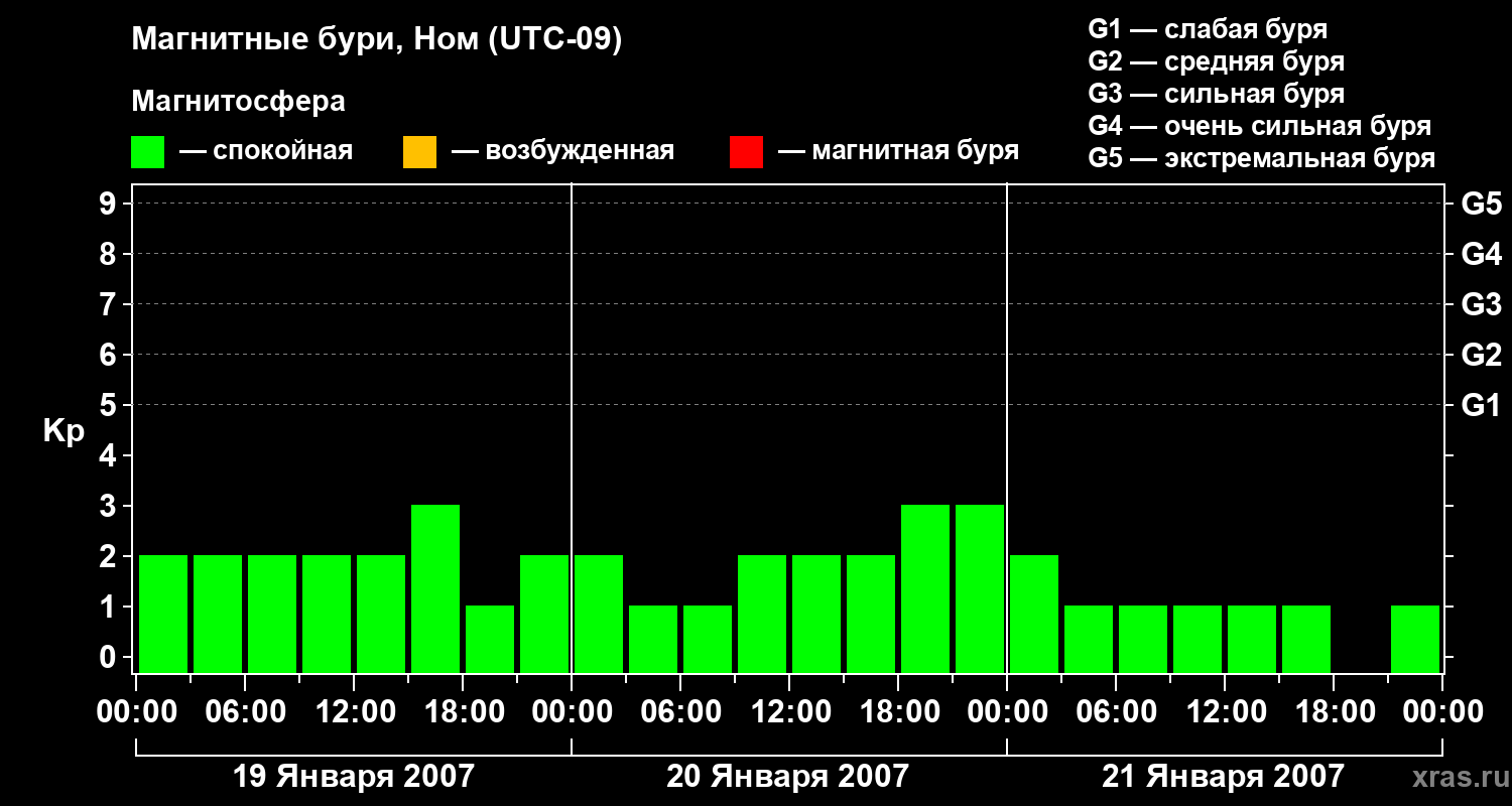 Изменения геомагнитного индекса Kp с 19 по 21 января 2007 года для средних широт