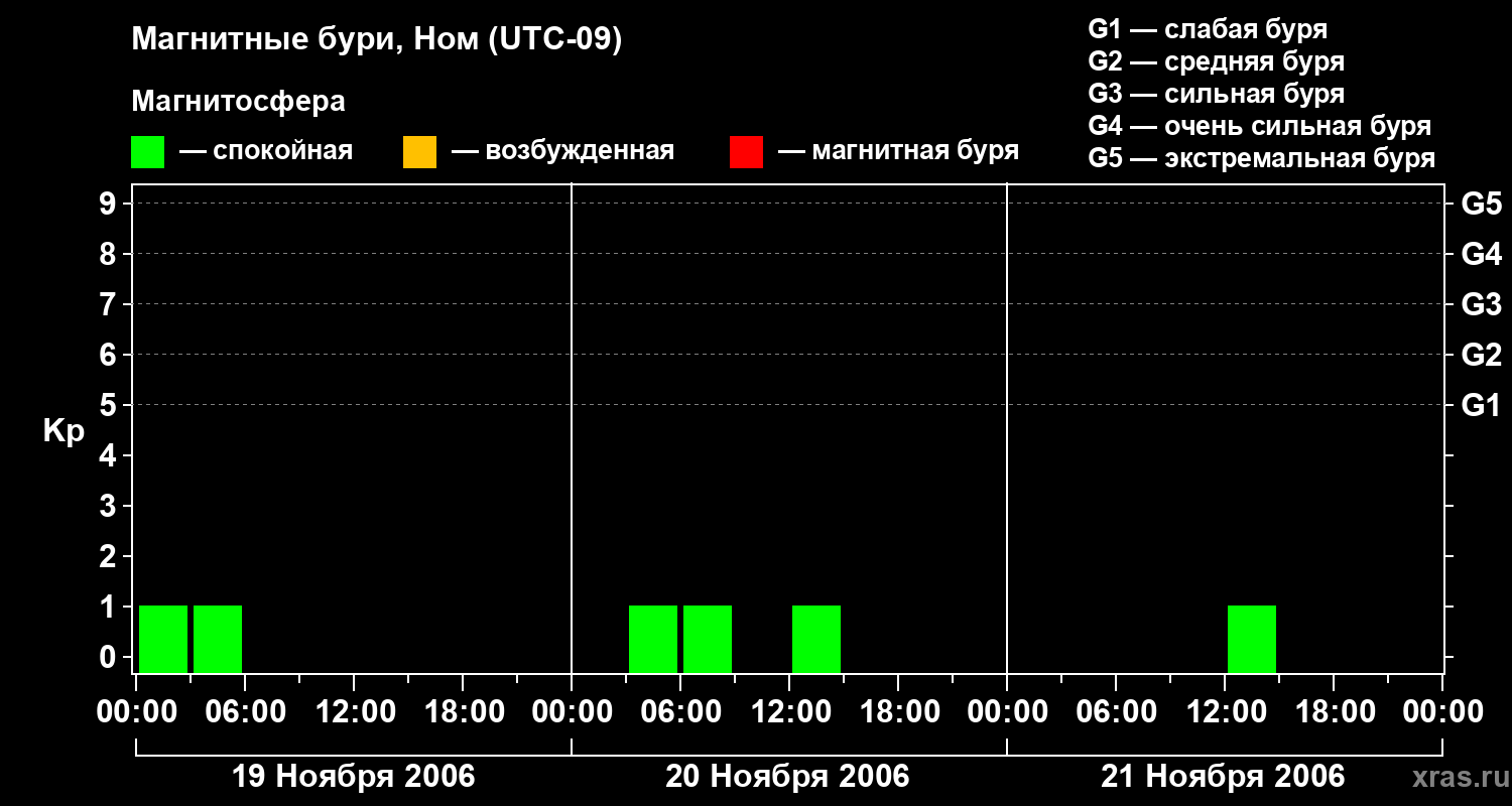 Изменения геомагнитного индекса Kp с 19 по 21 ноября 2006 года для средних широт