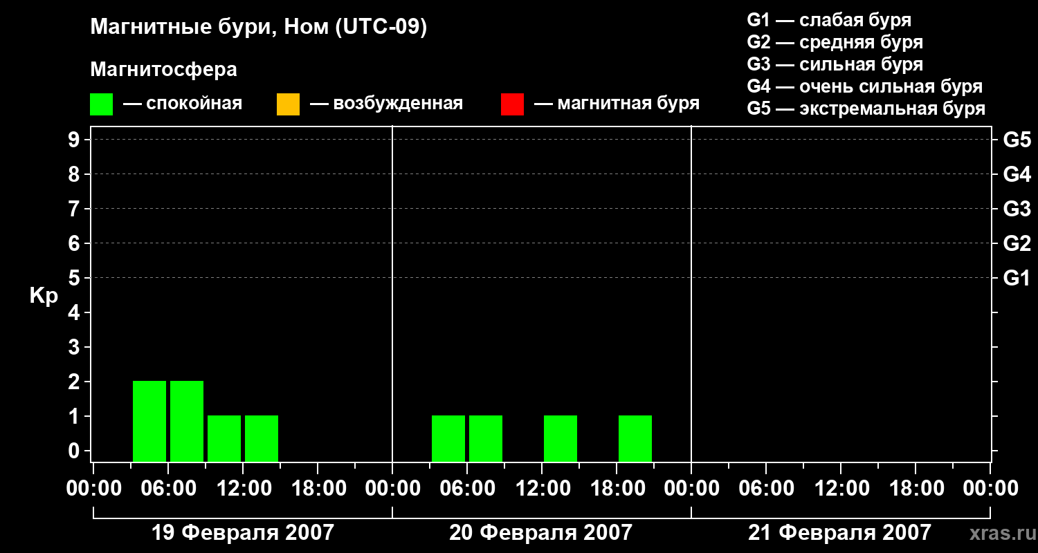 Изменения геомагнитного индекса Kp с 19 по 21 февраля 2007 года для средних широт