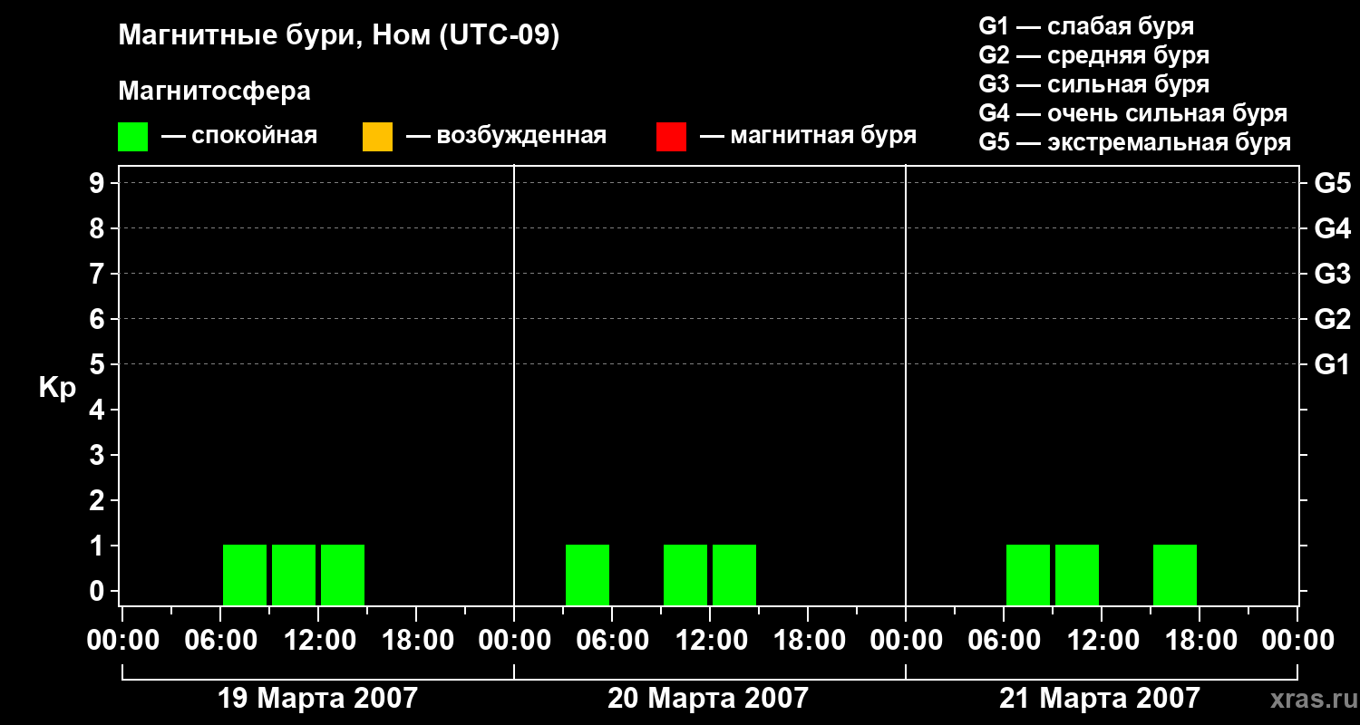 Изменения геомагнитного индекса Kp с 19 по 21 марта 2007 года для средних широт