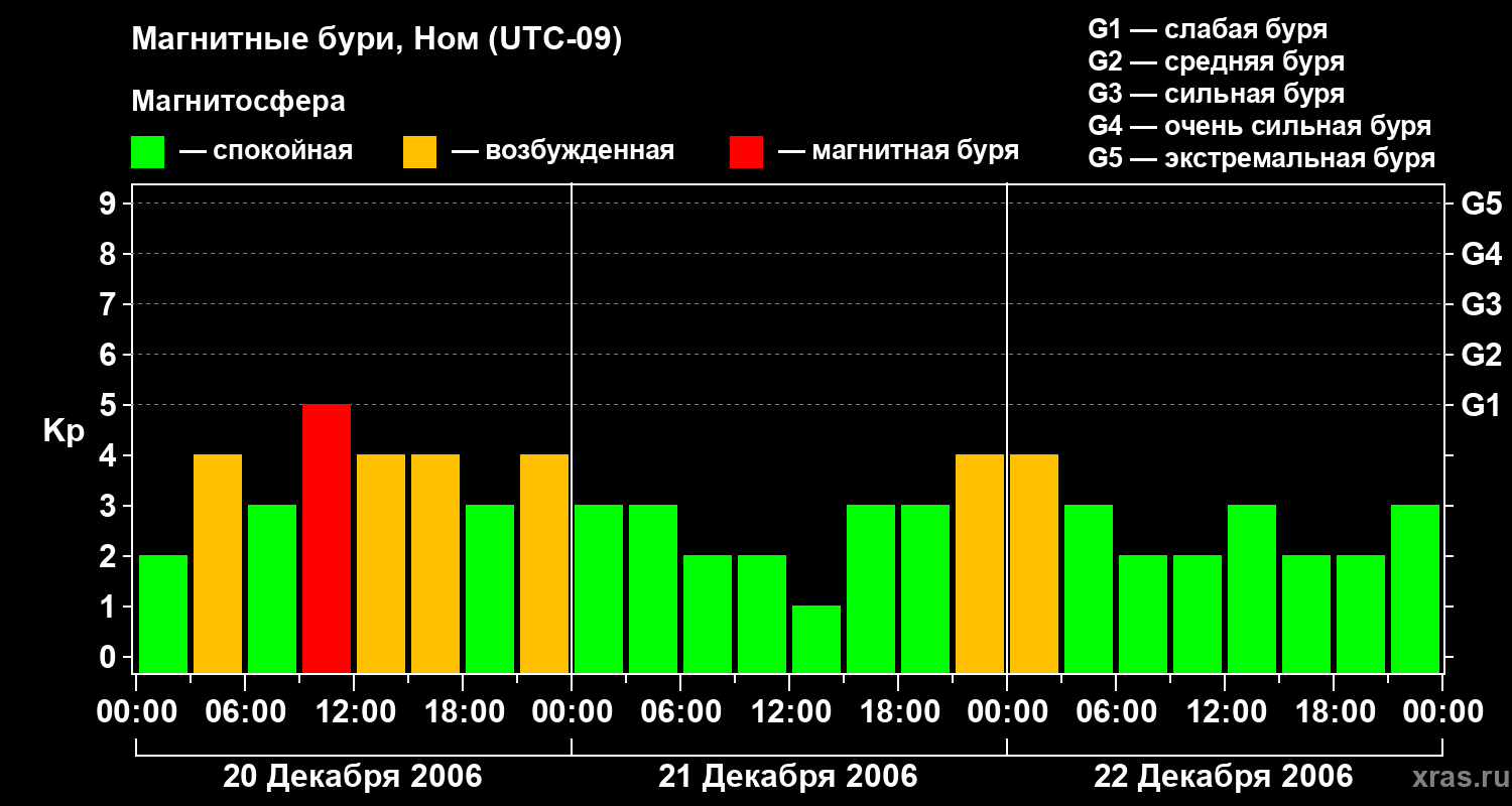Изменения геомагнитного индекса Kp с 20 по 22 декабря 2006 года для средних широт
