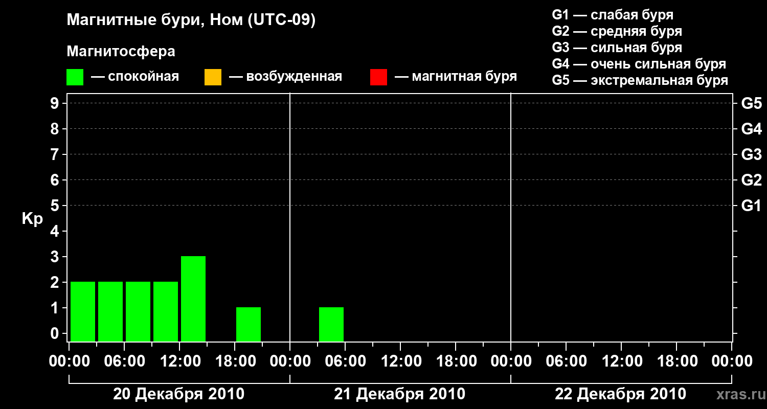 Изменения геомагнитного индекса Kp с 20 по 22 декабря 2010 года для средних широт