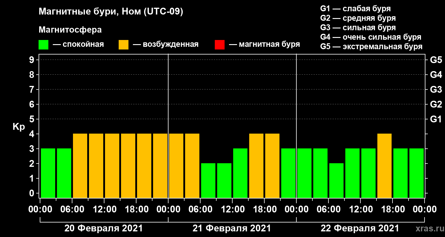 Изменения геомагнитного индекса Kp с 20 по 22 февраля 2021 года для средних широт