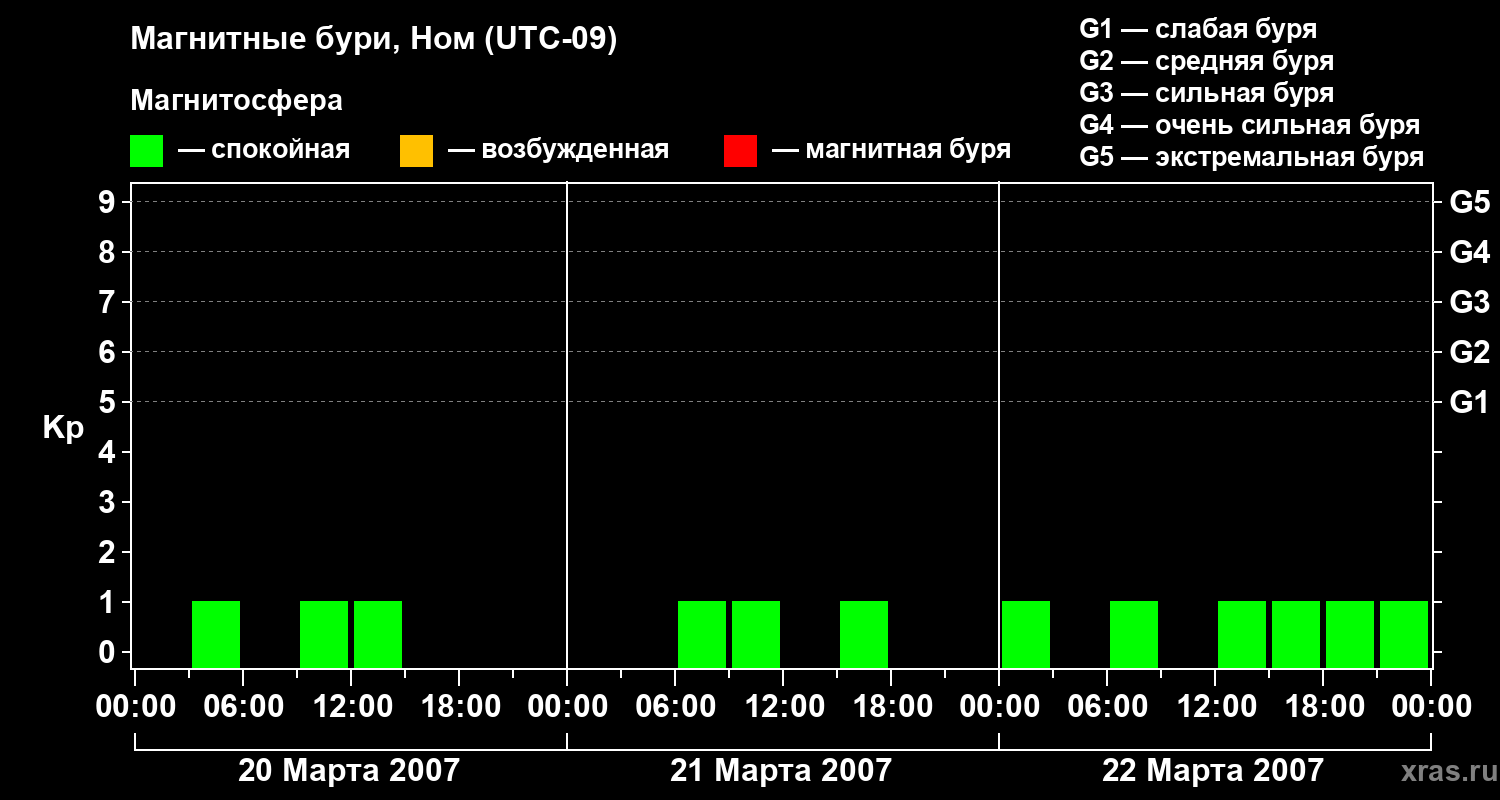 Изменения геомагнитного индекса Kp с 20 по 22 марта 2007 года для средних широт