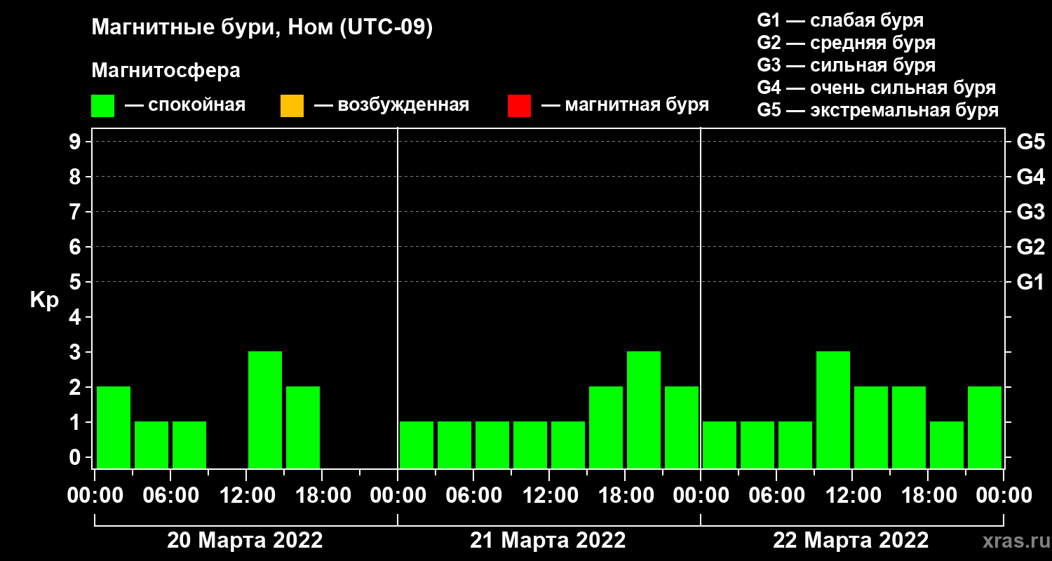 Изменения геомагнитного индекса Kp с 20 по 22 марта 2022 года для средних широт