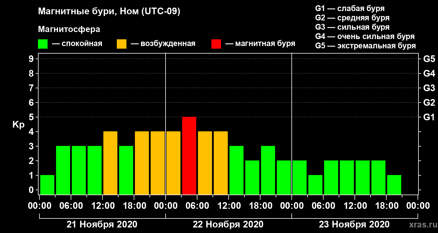 Изменения геомагнитного индекса Kp с 21 по 23 ноября 2020 года для средних широт