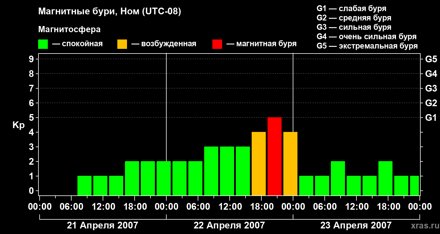Изменения геомагнитного индекса Kp с 21 по 23 апреля 2007 года для средних широт