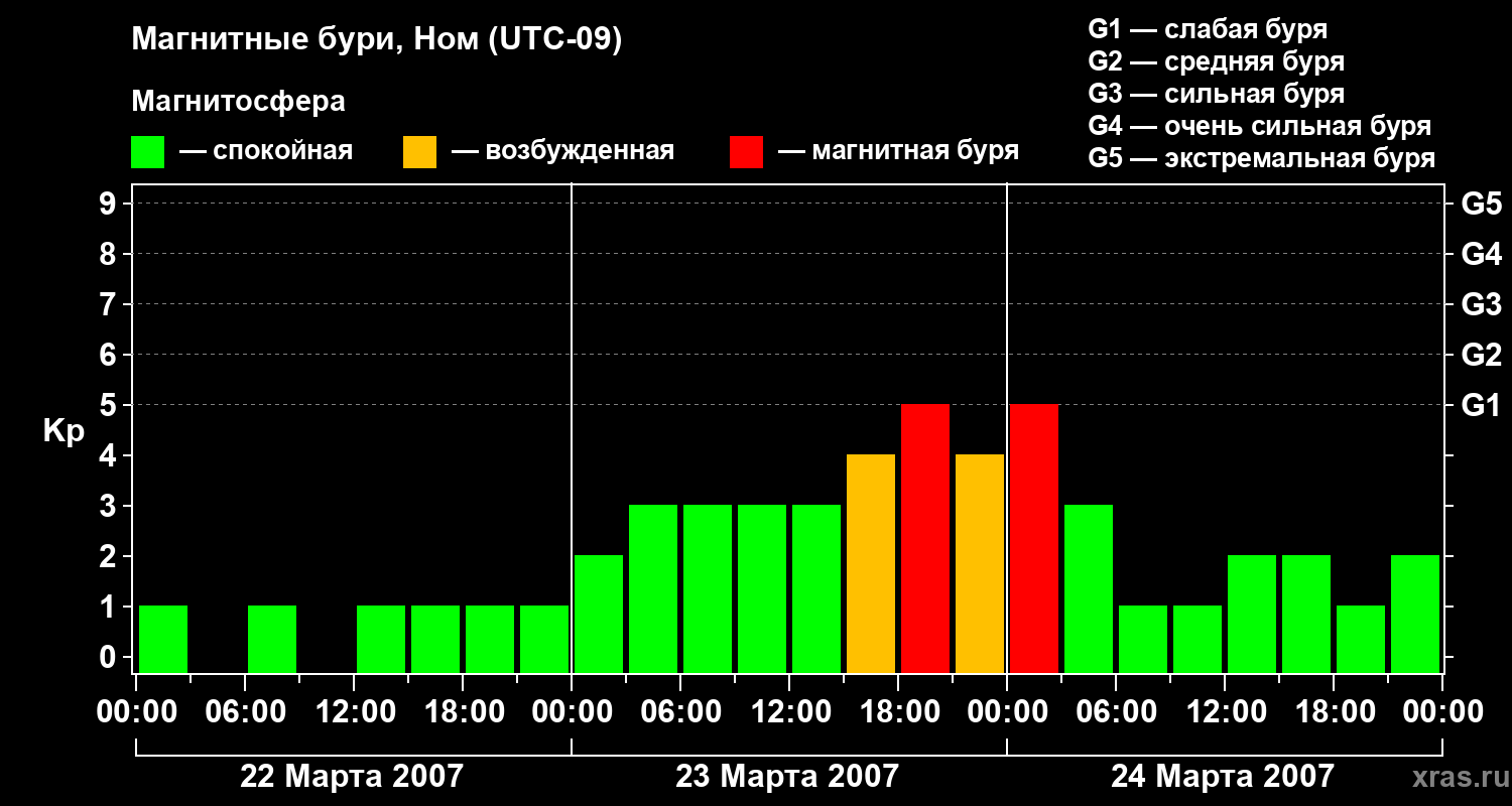 Изменения геомагнитного индекса Kp с 22 по 24 марта 2007 года для средних широт
