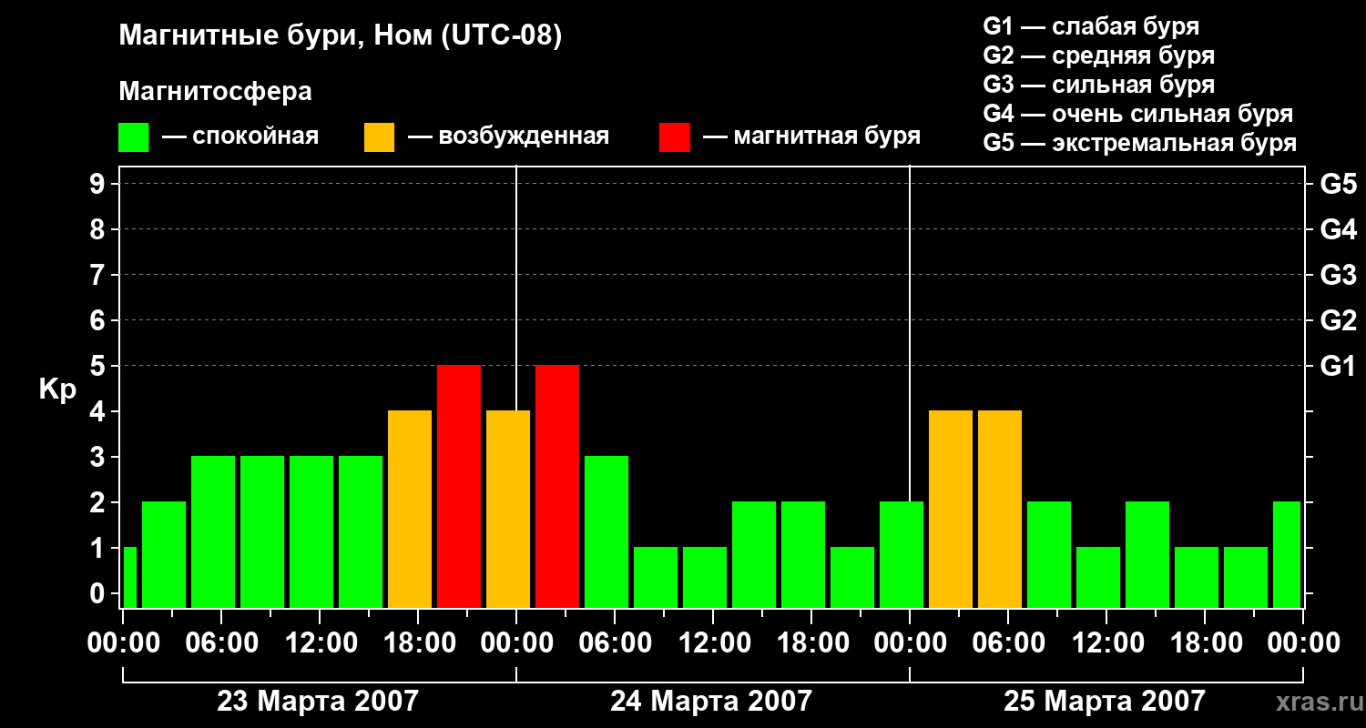Изменения геомагнитного индекса Kp с 23 по 25 марта 2007 года для средних широт