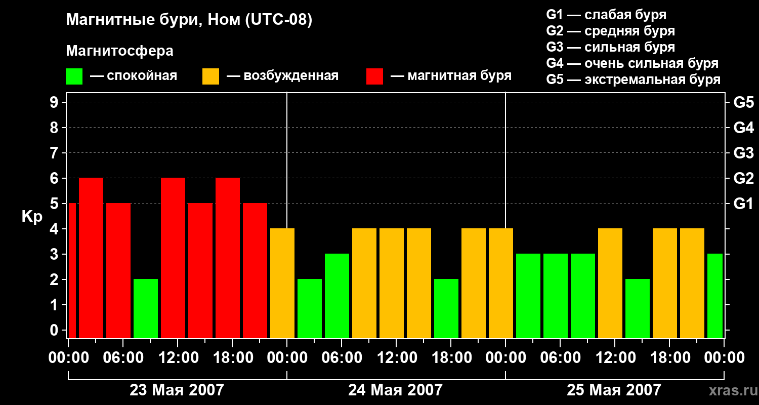 Изменения геомагнитного индекса Kp с 23 по 25 мая 2007 года для средних широт