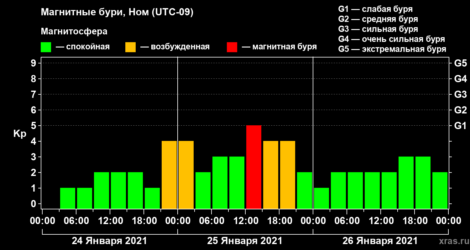 Изменения геомагнитного индекса Kp с 24 по 26 января 2021 года для средних широт