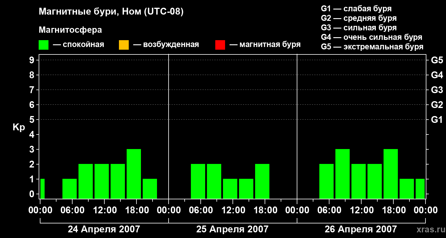 Изменения геомагнитного индекса Kp с 24 по 26 апреля 2007 года для средних широт