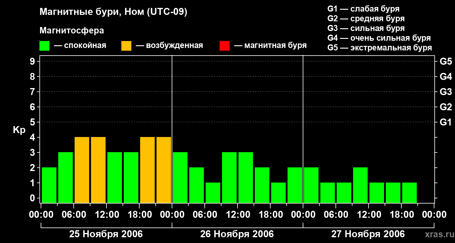 Изменения геомагнитного индекса Kp с 25 по 27 ноября 2006 года для средних широт