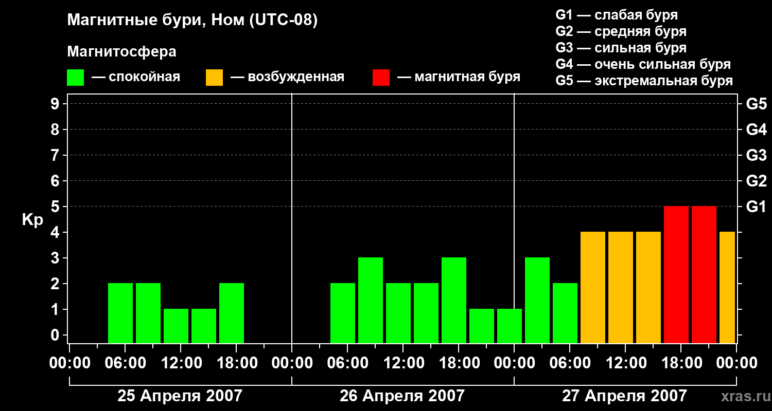 Изменения геомагнитного индекса Kp с 25 по 27 апреля 2007 года для средних широт