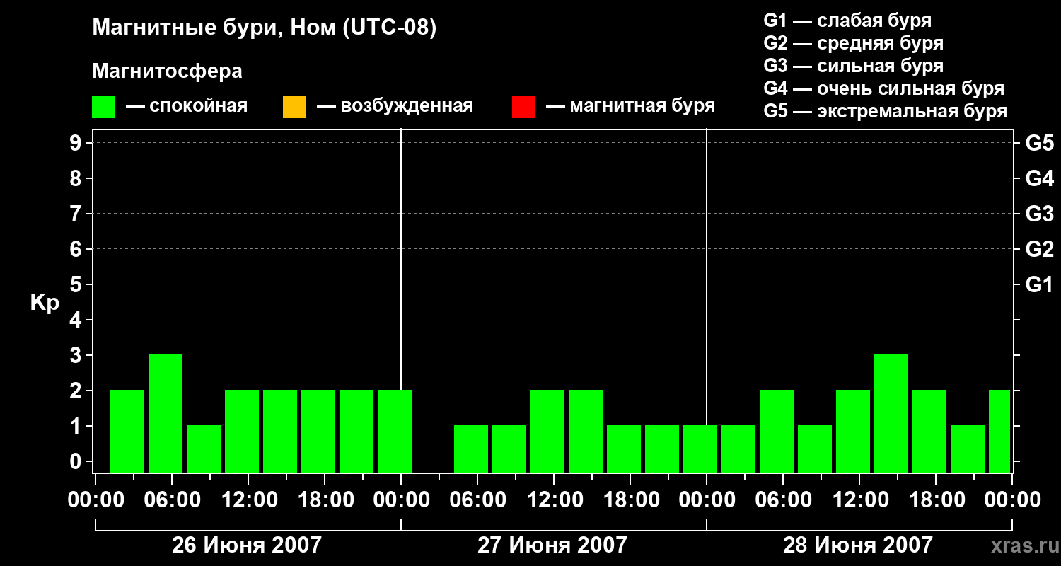 Изменения геомагнитного индекса Kp с 26 по 28 июня 2007 года для средних широт