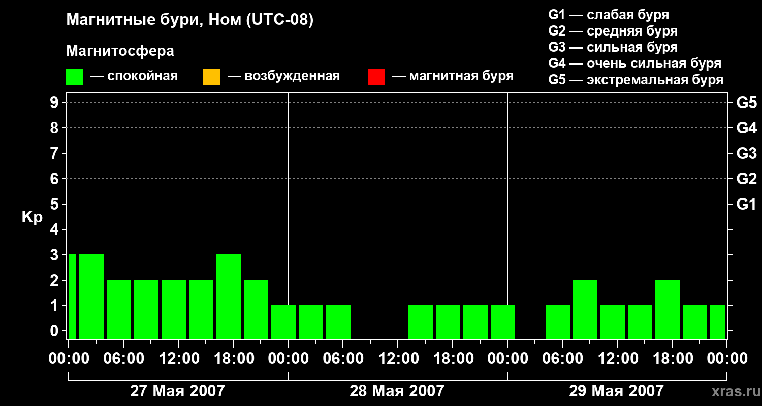 Изменения геомагнитного индекса Kp с 27 по 29 мая 2007 года для средних широт