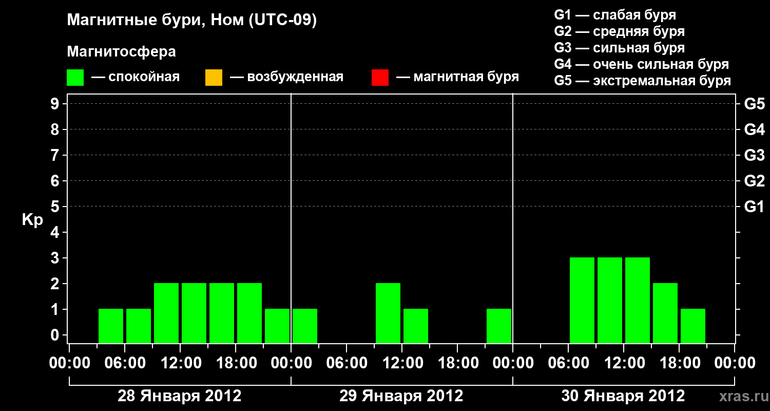 Изменения геомагнитного индекса Kp с 28 по 30 января 2012 года для средних широт