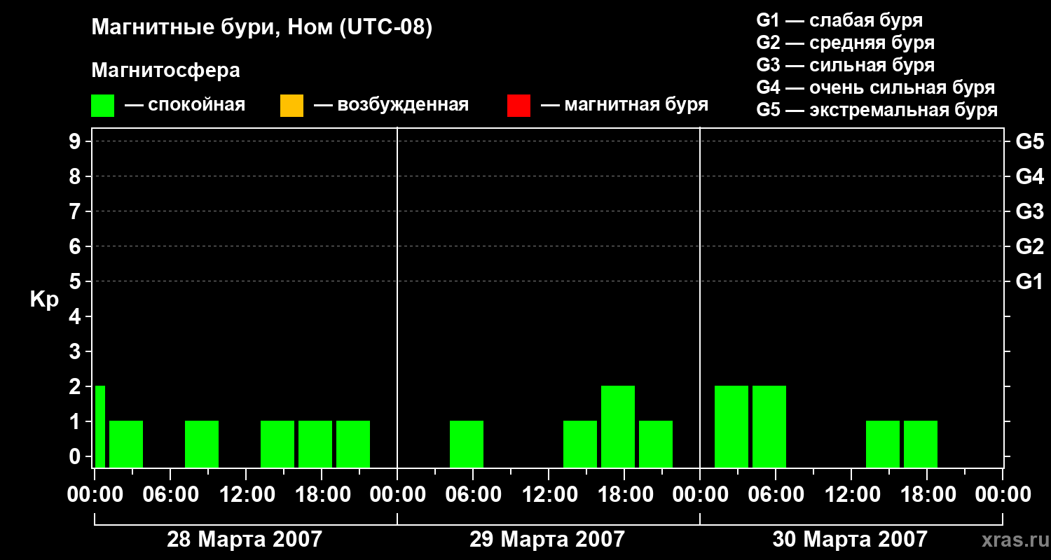 Изменения геомагнитного индекса Kp с 28 по 30 марта 2007 года для средних широт