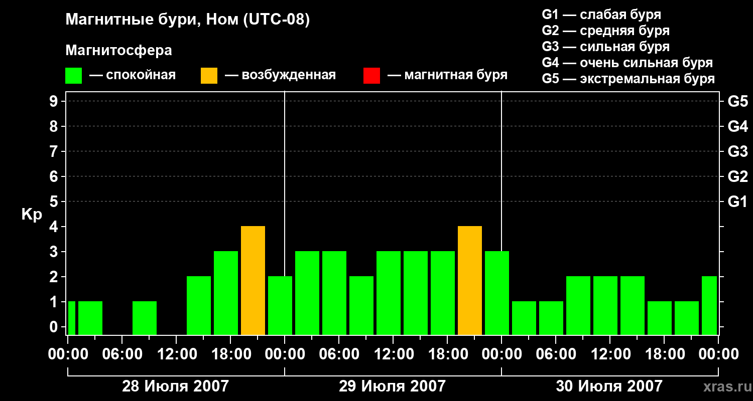Изменения геомагнитного индекса Kp с 28 по 30 июля 2007 года для средних широт