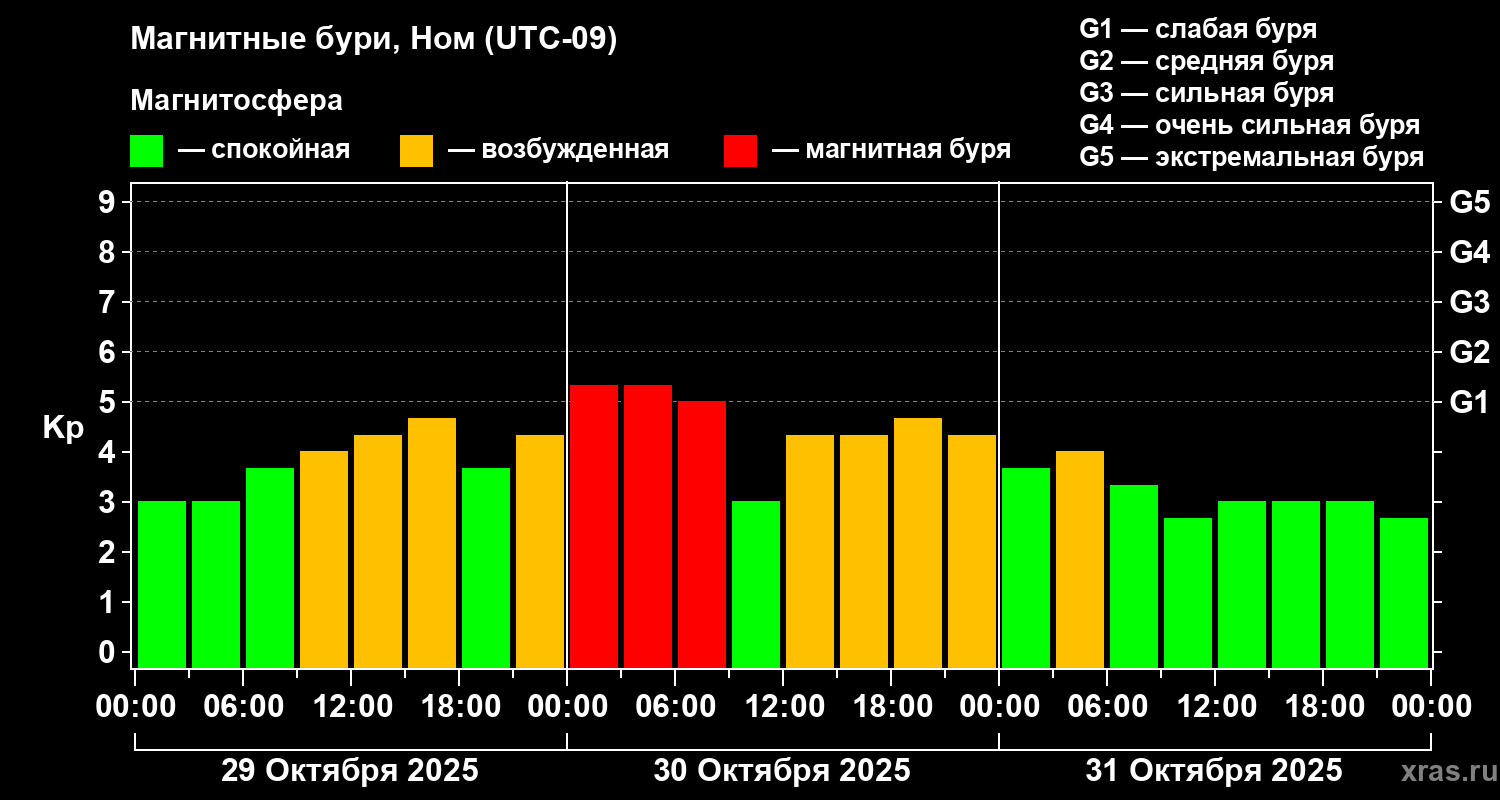 Изменения геомагнитного индекса Kp с 29 по 31 октября 2025 года для средних широт