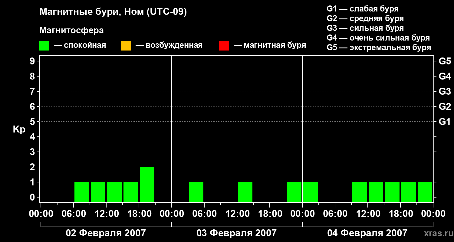Изменения геомагнитного индекса Kp с 2 по 4 февраля 2007 года для средних широт
