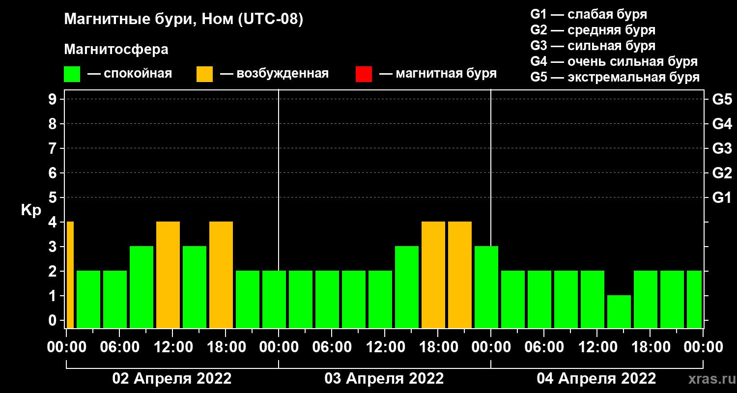 Изменения геомагнитного индекса Kp с 2 по 4 апреля 2022 года для средних широт