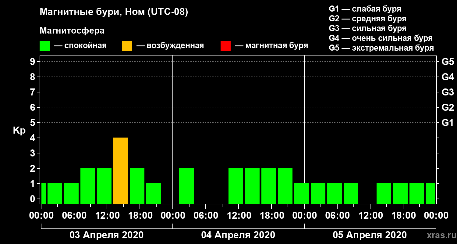 Изменения геомагнитного индекса Kp с 3 по 5 апреля 2020 года для средних широт