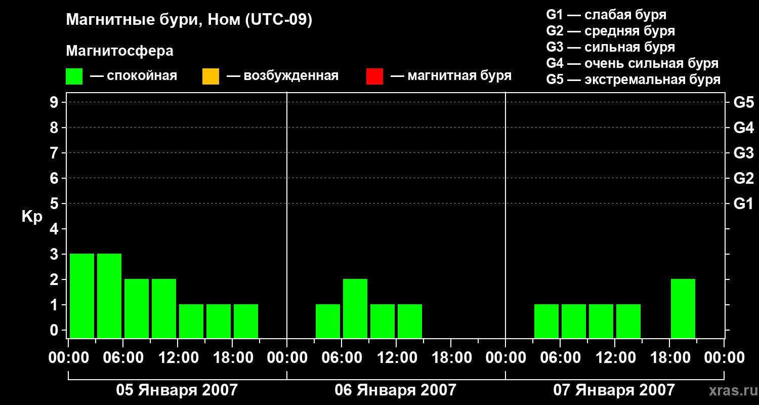 Изменения геомагнитного индекса Kp с 5 по 7 января 2007 года для средних широт